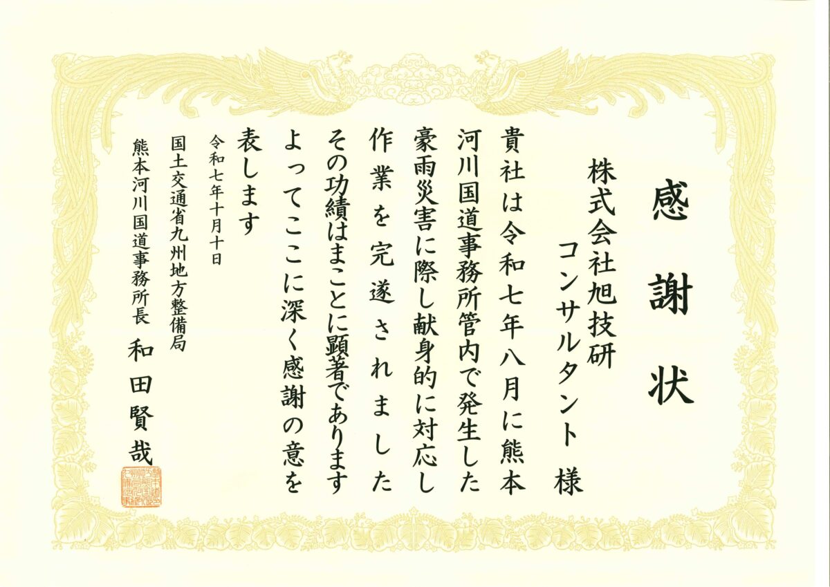 このたび株式会社旭技研コンサルタントは、令和7年8月に熊本河川国道事務所管内で発生した豪雨災害において、災害協定に基づき迅速かつ献身的な対応を行い、復旧作業を完遂したことにより、国土交通省九州地方整備局 熊本河川国道事務所より感謝状をいただきました。