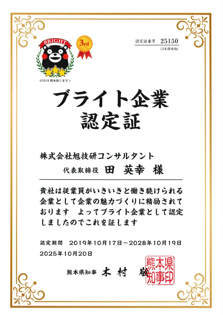 株式会社旭技研コンサルタントは、2019年10月より『ブライト企業』として認定を受けており、2025年10月に2度目の更新を行い、無事に認定更新することができました。